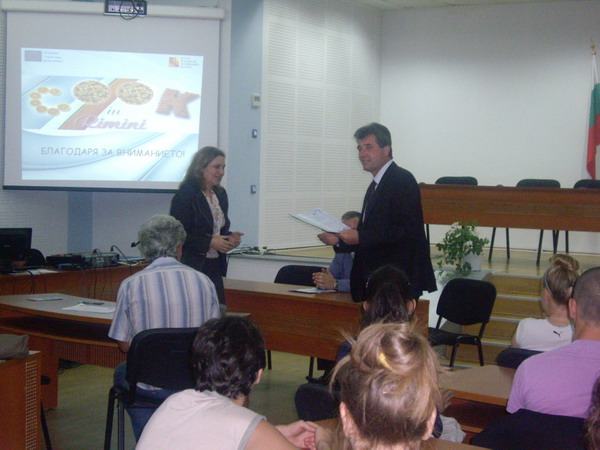 П О К А Н А за семинар проект Уважаеми ученици, родители, учители, директори, работодатели, представители на медиите, Професионална гимназия по лека промишленост и строителство и екипът за управление на проекта Ви кани на С Е М И Н А Р за отчитане на дейностите по проекта и връчване на сертификатите на участниците. След семинара ще можете да се насладите на италианската кухня, като опитате специалитети, подготвени от участниците в мобилността. Семинарът ще се проведе на 27.05.2013г. (понеделник) от 14:00 часа в Зала 1 на Община Свищов. ОЧАКВАМЕ ВИ! Успешно завърши мобилността в Италия